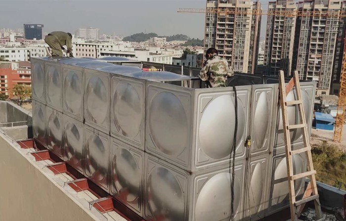1、不銹鋼拼裝水箱由1*1的單張方形沖壓好的不銹鋼板拼裝焊接而成,與現代的建筑遙相呼應,具有時代感。